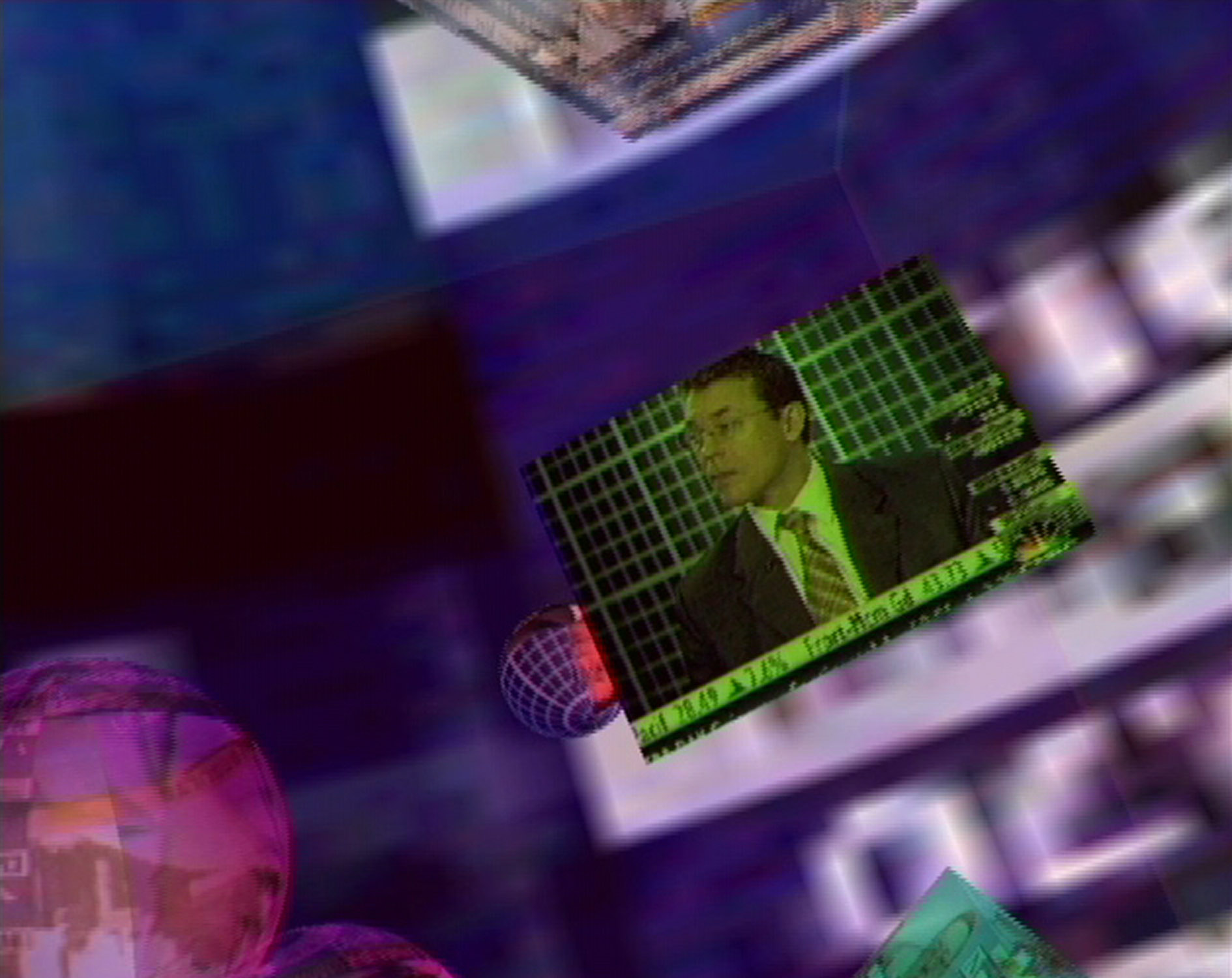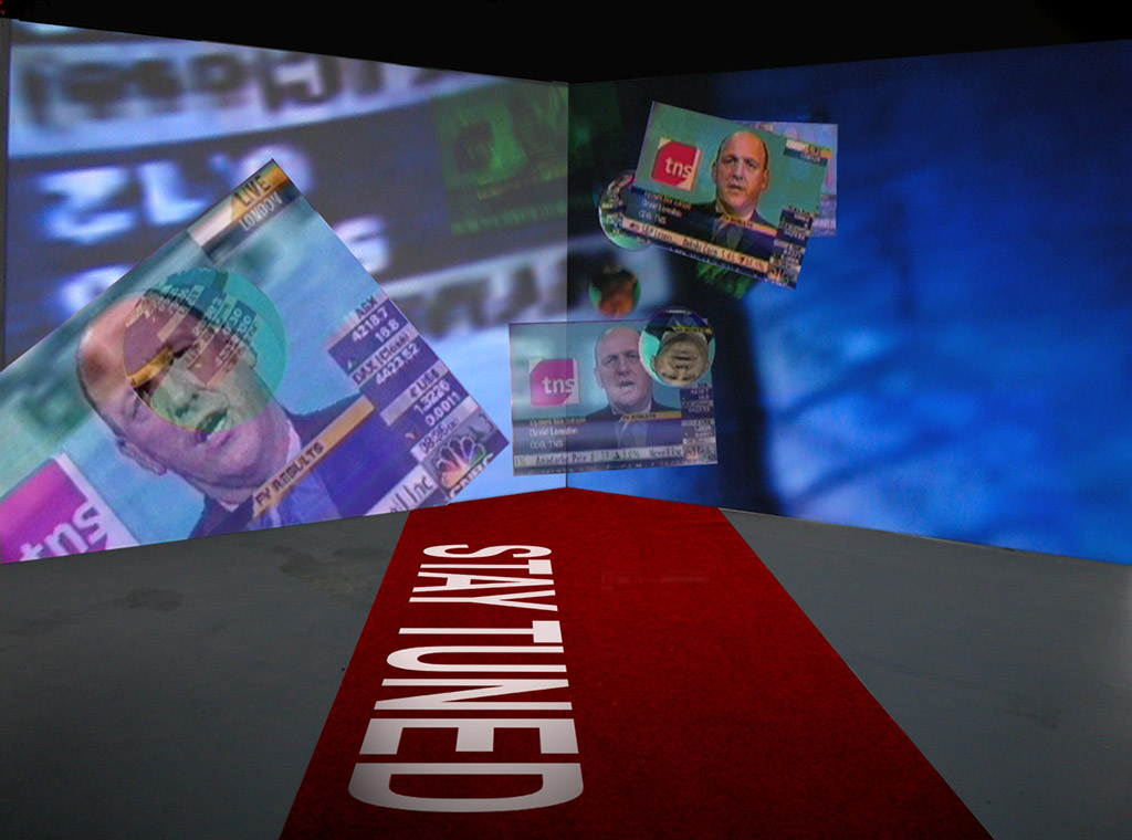 The perpetual stream of television news channels is captured and vividly rendered live upon the surfaces of 3D shapes within a virtual reality environment. Words, phrases, gestures, facial expressions, and symbolic images from advertisements lose their original context through incessant repetition and parallel display, beginning to influence one another as they navigate and rebound within the 3D space. The outcome is a chronicle of newsworthy events, temporally dislocated and presented in a frenetic fashion, employing the same glittering aesthetics utilized by news channels to draw in viewers. Herein, the meticulously crafted corporate identity, the captivating images of advertisements, and the scintillating videographic allure of news channels paradoxically demolish their own content.Artist in residence project, production of Netherlands Media Art Institute Montevideo/Time Based Arts